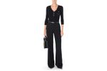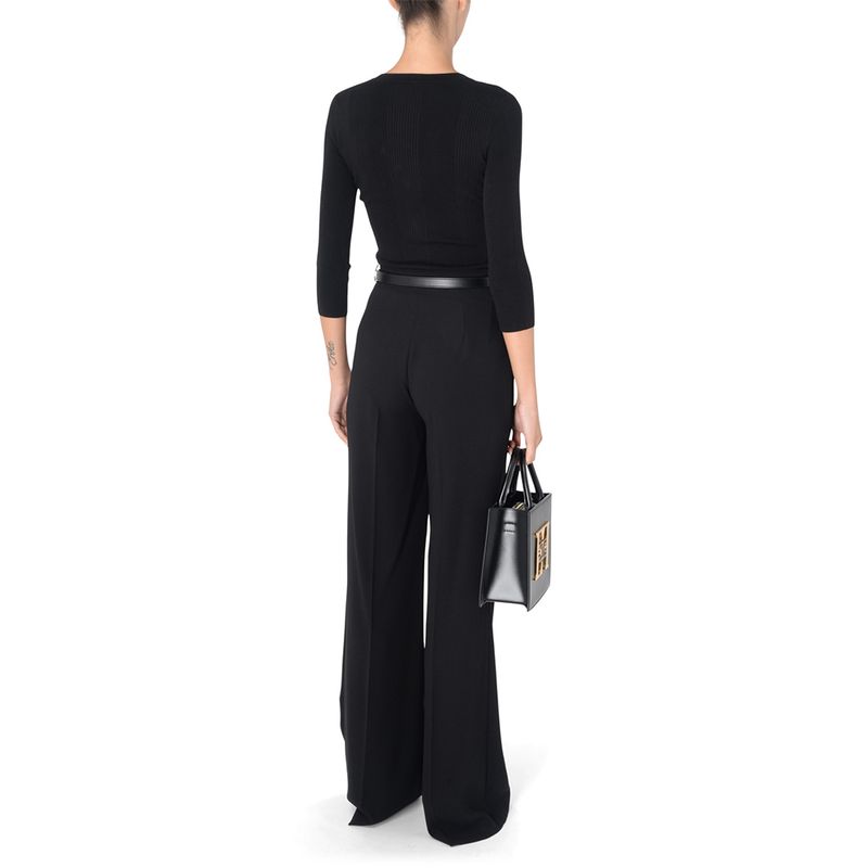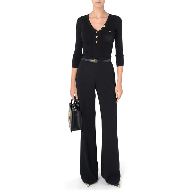 Sweater Elisabetta Franchi para mujer confeccionado en una rinada mezcla de lyocell, poliamida y seda que garantiza suavidad, elasticidad y una sensación ligera sobre la piel. Presenta un diseño de punto acanalado que estiliza la silueta, escote en V femenino y cierre frontal decorado con botones dorados de inspiración joya que aportan un toque distintivo y lujoso. Incluye un bolsillo frontal con botón y detalle del logo en relieve que ruerza la identidad de la marca. Su color negro lo convierte en una prenda versátil y atemporal, ideal para looks elegantes de día o de noche, combinando perfectamente con pantalones sastre, faldas midi o jeans de tiro alto