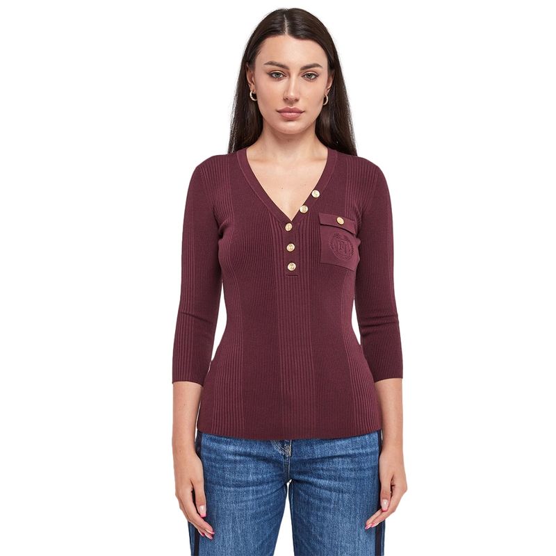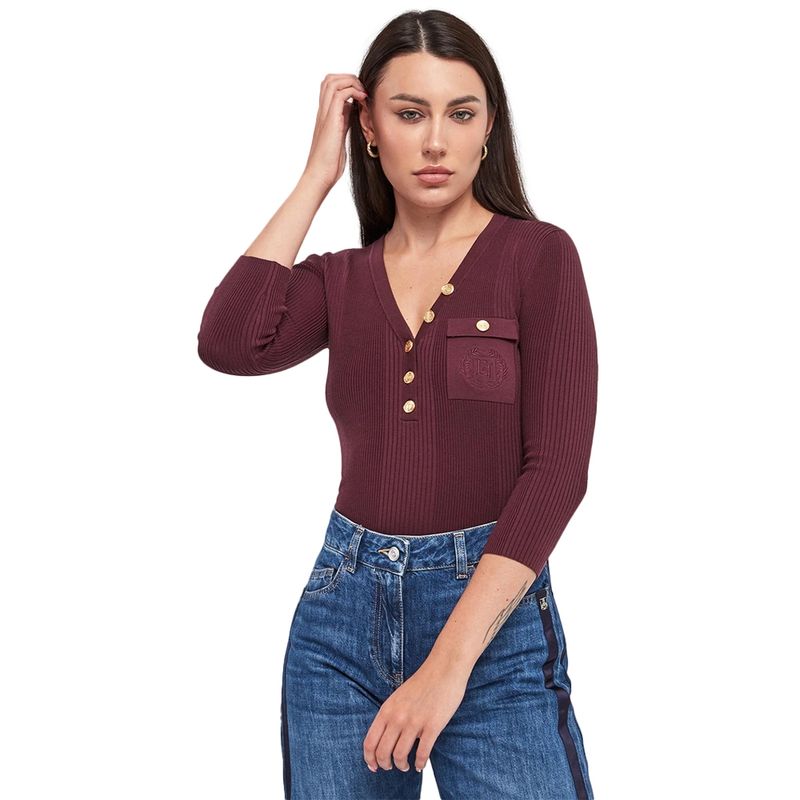Sweater Elisabetta Franchi vinotinto con escote en V y botones dorados para mujer