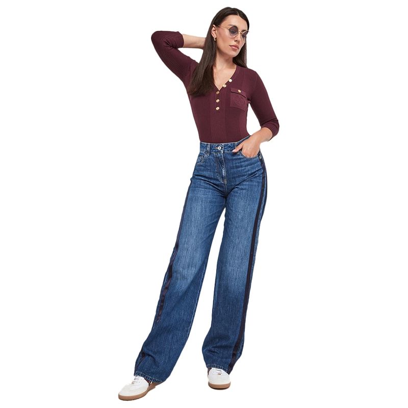 Sweater Elisabetta Franchi para mujer confeccionado en una sofisticada mezcla de lyocell, poliamida y seda que ofrece suavidad, ligereza y un ajuste cómodo al cuerpo. Su diseño de punto acanalado estiliza la figura, mientras que el escote en V aporta un toque femenino y favorecedor. Incorpora botones dorados de inspiración joya en el cierre frontal y en el bolsillo decorativo con logo en relieve, elementos distintivos de la marca que elevan el diseño. El color vinotinto añade profundidad y sofisticación, convirtiéndolo en una prenda ideal para looks elegantes tanto de día como de noche, combinable con jeans, pantalones sastre o faldas de corte midi