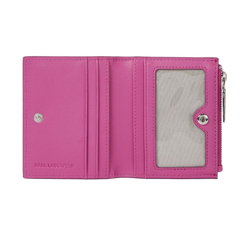 Tarjetero bifold Karl Lagerfeld, confeccionada en poliuretano. Presenta un diseño moderno con letras de la marca en relieve, ideal para quienes buscan un accesorio funcional y sofisticado. Su cierre tipo billetera asegura seguridad y organización, perfecta para el día a día.
