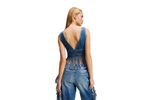 Top en mezclilla suave con diseño de flecos y escote profundo que resalta el estilo moderno.