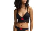 Top de encaje delicado con banda elástica y detalle de logotipo en contraste.