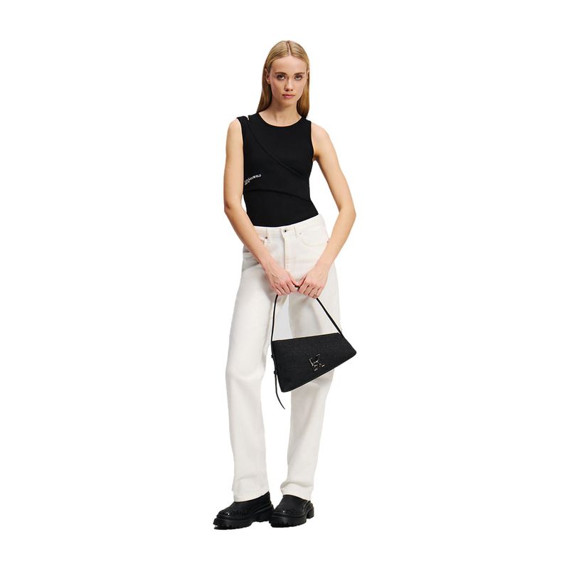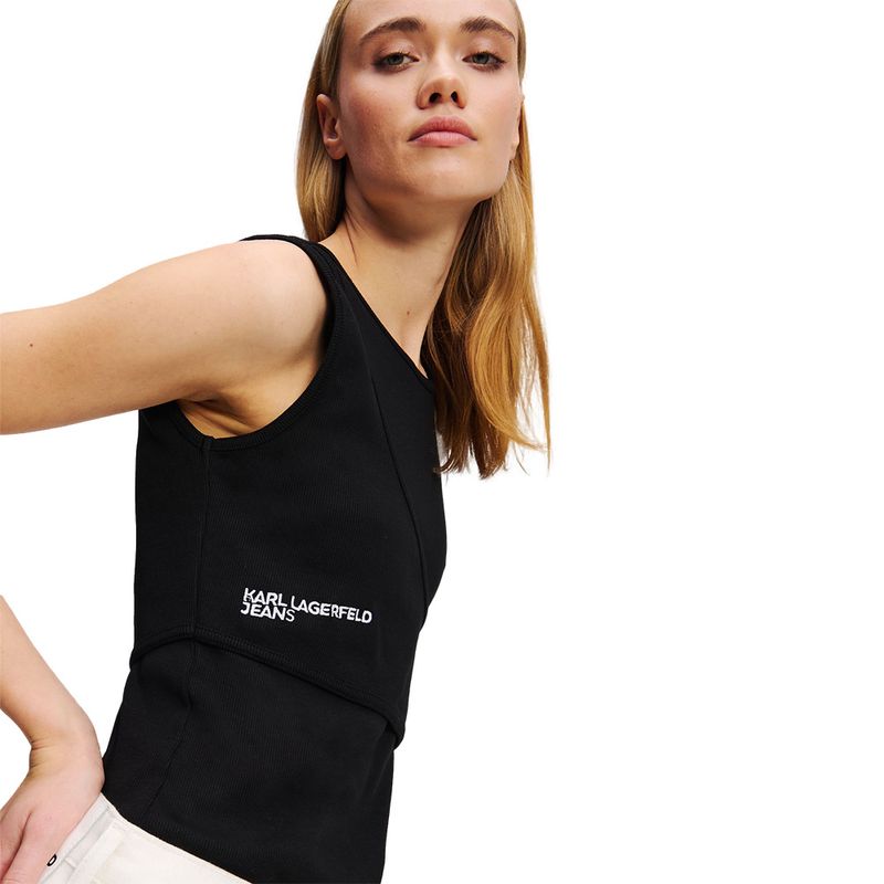 Top Karl Lagerfeld para mujer confeccionado en tejido acanalado de 95% ALGODÓN y 5% ELASTANO, que ofrece comodidad, elasticidad y un ajuste favorecedor. Su diseño sin mangas con escote redondo es atemporal y versátil, ideal para diferentes ocasiones. Destaca por su doble tira asimétrica entrecruzada en el hombro derecho, un detalle vanguardista que aporta dinamismo y originalidad al look. El discreto logotipo bordado de Karl Lagerfeld Jeans en el lateral derecho completa esta prenda minimalista y sofisticada, perfecta para combinar con jeans, pantalones de tela o faldas y crear conjuntos modernos y elegantes.