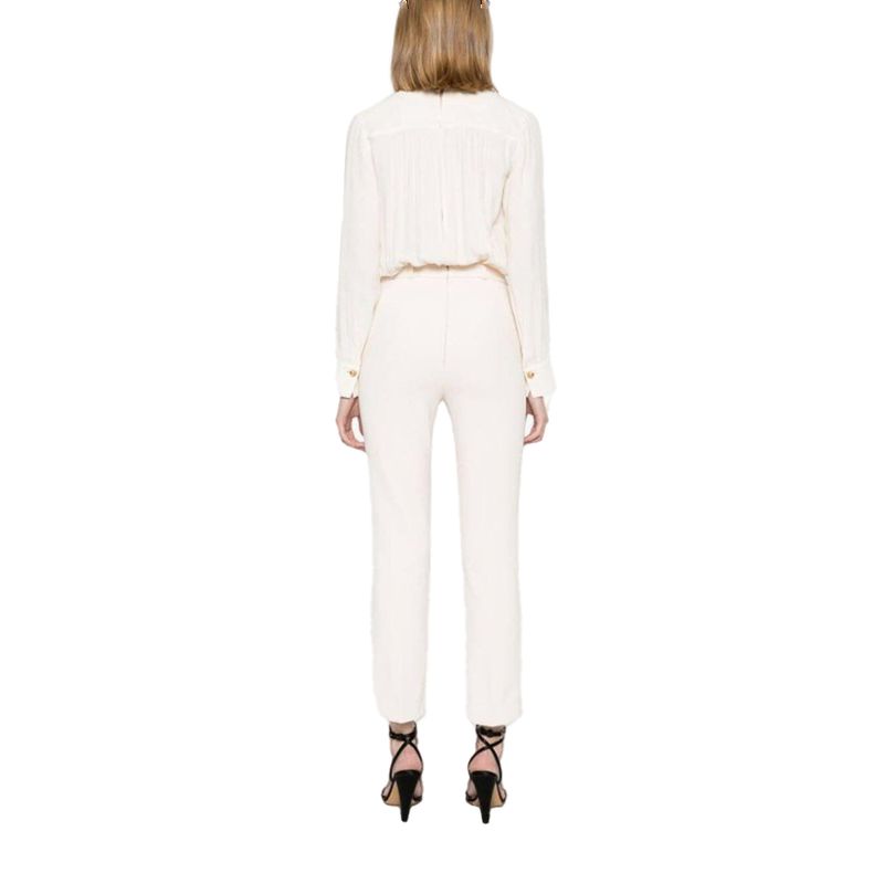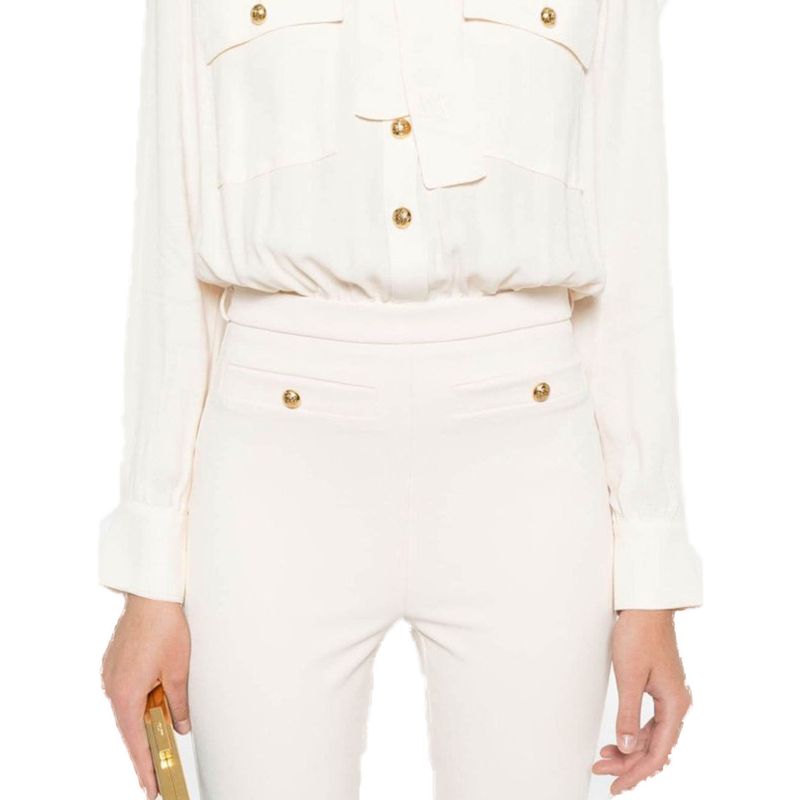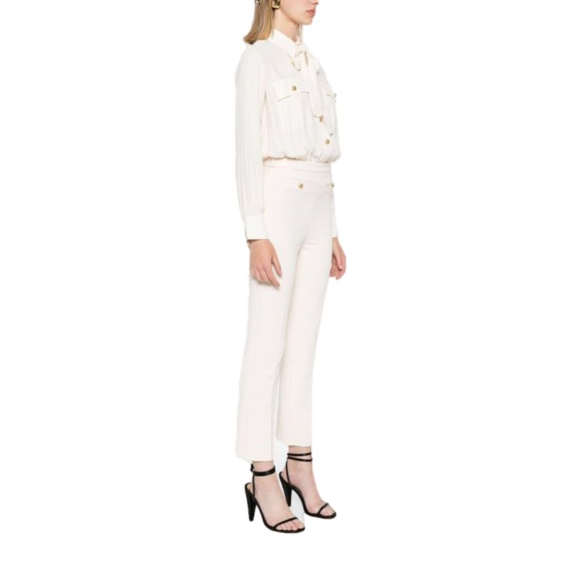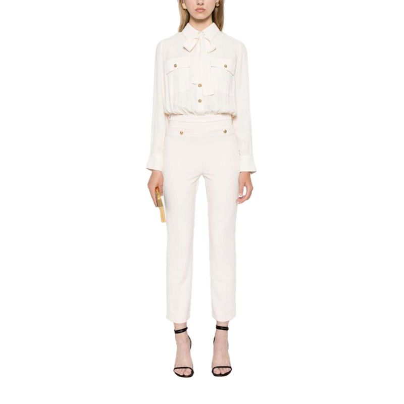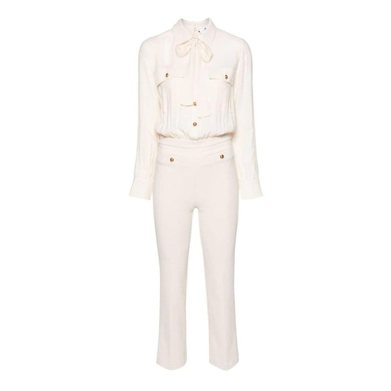 Traje Elisabetta Franchi para mujer confeccionado en una sofisticada mezcla de poliéster con elastano que garantiza comodidad, estructura y un ajuste impecable. El diseño incorpora una blusa integrada de manga larga con lazada en el cuello, bolsillos decorativos y botones dorados que aportan un toque femenino y rinado. El pantalón de corte recto estiliza la silueta y equilibra la elegancia del conjunto. Su tonalidad beige lo convierte en una prenda versátil y luminosa, ideal para ocasiones formales, eventos especiales o looks de oficina con carácter distinguido. Un conjunto icónico que rleja el estilo elegante y contemporáneo de la firma italiana