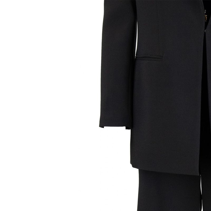 Traje Elisabetta Franchi para mujer compuesto por chaqueta y pantalón confeccionados en una mezcla de poliéster y elastano que garantiza estructura, comodidad y un ajuste impecable. La chaqueta presenta un diseño sastre clásico con solapas dinidas y cierre frontal limpio, aportando una estética elegante y atemporal. El pantalón de corte recto estiliza la figura y completa un look rinado y versátil. Este conjunto es ideal para ocasiones formales, eventos especiales o estilismos de oficina con un toque de lujo contemporáneo característico de la firma italiana