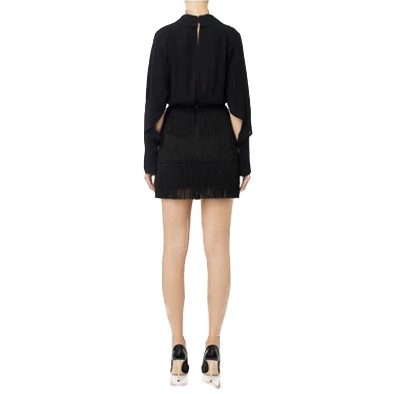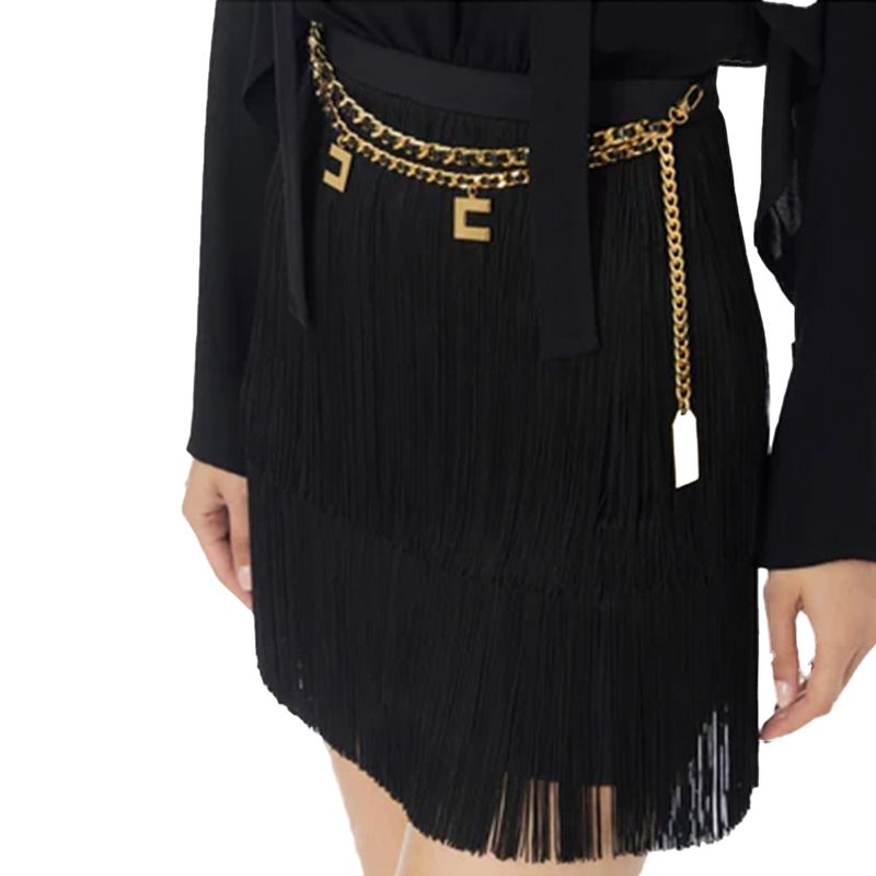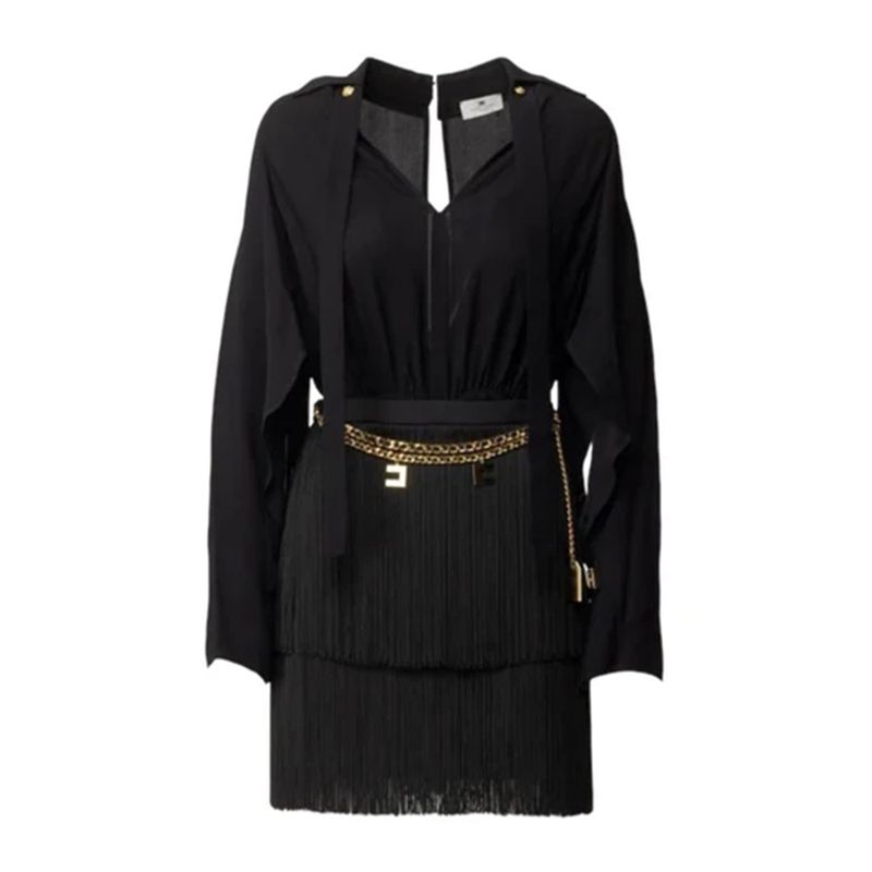Vestido corto Elisabetta Franchi para mujer, confeccionado en un tejido elástico de alta calidad que proporciona un ajuste cómodo y favorecedor. Su diseño incorpora mangas largas con caída fluida, un escote discreto y una falda con flecos en capas que aportan movimiento y sofisticación. Incluye un cinturón decorativo con cadena metálica y detalles distintivos de la marca , que dinen la cintura y elevan el diseño con un toque elegante y moderno. Ideal para eventos nocturnos, celebraciones o ocasiones especiales, este vestido rleja el carácter glamuroso y rinado de Elisabetta Franchi.