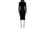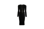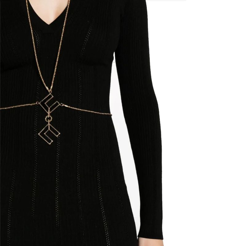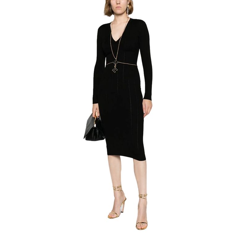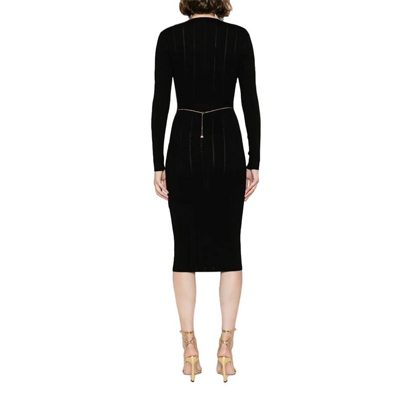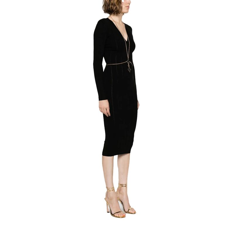 Vestido midi Elisabetta Franchi para mujer, confeccionado en tejido de punto con textura acanalada que se ajusta suavemente al cuerpo, resaltando la silueta femenina con un acabado elegante y moderno. Su diseño de manga larga y escote profundo se complementa con un distintivo accesorio joya dorado a la cintura, sello característico de la marca. Ideal para ocasiones especiales, eventos nocturnos o looks sofisticados, este vestido rleja el lujo y la feminidad propios del estilo italiano de Elisabetta Franchi