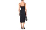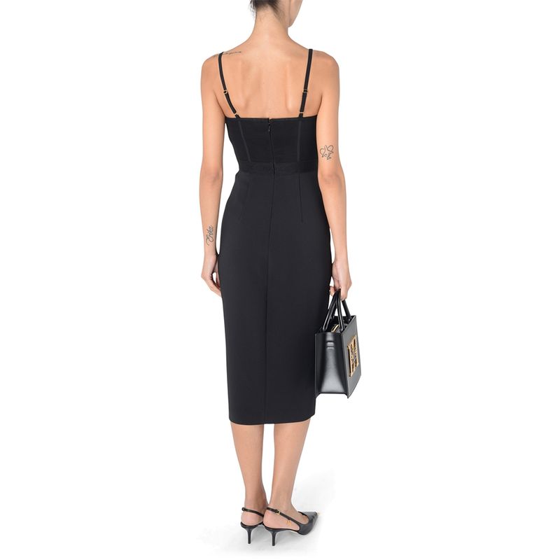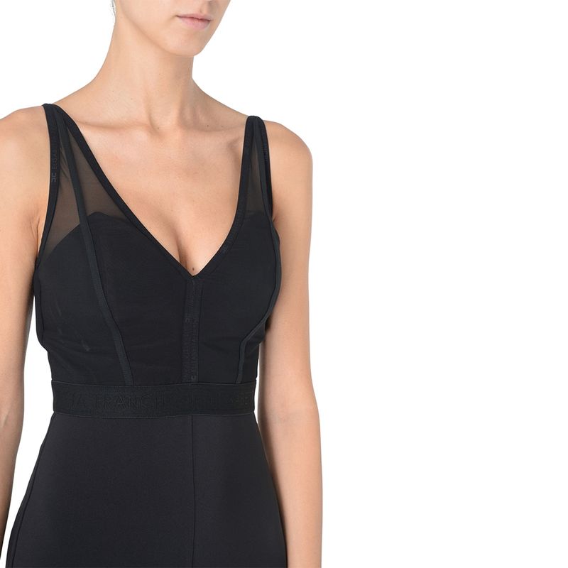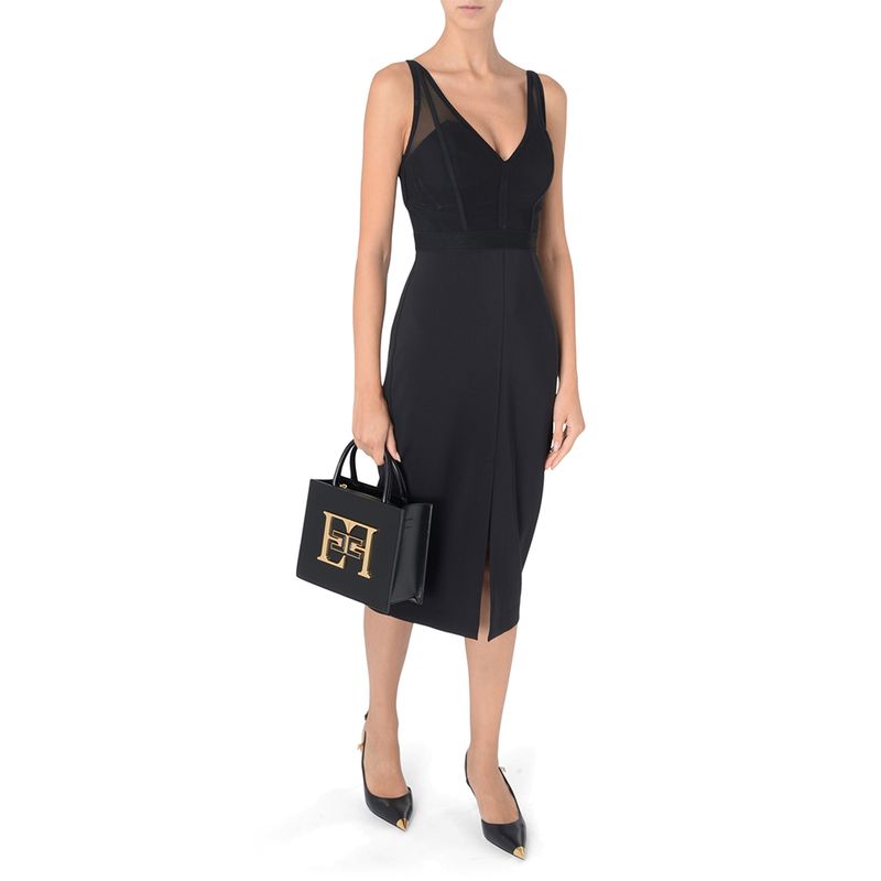 Vestido midi Elisabetta Franchi para mujer, confeccionado en tejido elástico de alta calidad que ofrece un ajuste cómodo y favorecedor. Su diseño presenta un escote profundo en V con delicados insertos de tul transparente en los hombros, aportando un toque elegante y femenino. La silueta entallada realza la figura, mientras que la abertura posterior facilita el movimiento y añade un detalle sutil de sensualidad. Ideal para eventos formales, cenas elegantes o ocasiones especiales, este vestido rleja la sofisticación, el minimalismo y el lujo característicos de Elisabetta Franchi