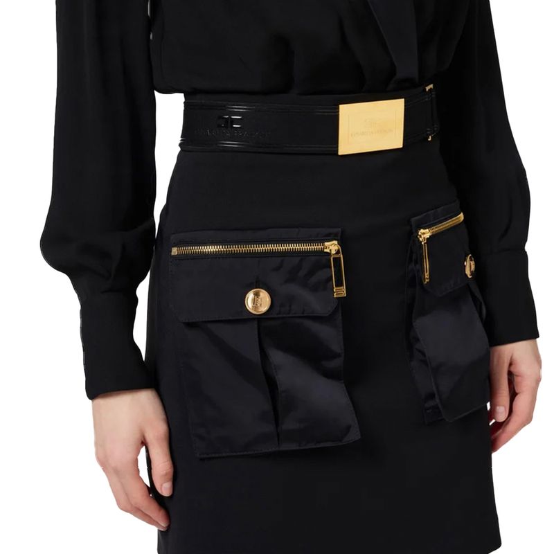 Vestido tipo blazer Elisabetta Franchi para mujer, confeccionado en tejido elástico de alta calidad que garantiza un ajuste cómodo y favorecedor. Su diseño presenta solapas clásicas, mangas largas y un cinturón estructurado con hebilla metálica distintiva de la marca que dine la cintura y estiliza la silueta. Incorpora bolsillos frontales con cierre metálico decorativo que aportan un toque moderno y funcional. Ideal para ocasiones formales, eventos ejecutivos o salidas nocturnas donde se busca un look elegante y poderoso, este vestido rleja la esencia sofisticada y contemporánea de Elisabetta Franchi