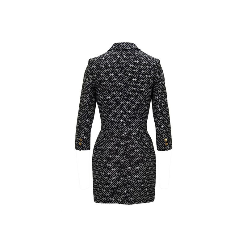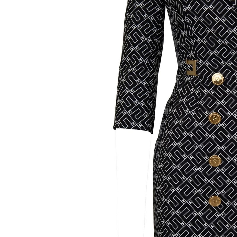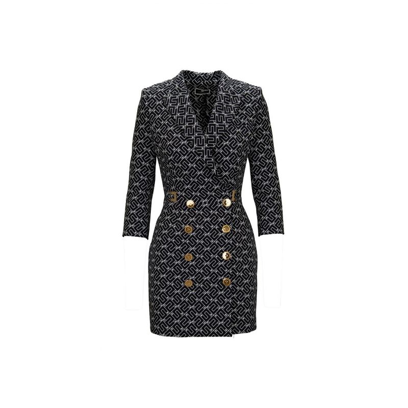 Vestido tipo blazer Elisabetta Franchi para mujer, confeccionado en tejido de alta calidad que ofrece una estructura firme y elegante. Su diseño presenta un sofisticado estampado geométrico en contraste blanco sobre fondo negro, característico del estilo rinado de la marca. Cuenta con doble botonadura frontal en acabado dorado que realza la silueta y aporta un toque distintivo y lujoso. De manga larga y corte entallado, es ideal para ocasiones formales, eventos especiales o looks ejecutivos con un enfoque moderno y femenino. Una prenda versátil que combina elegancia italiana y carácter contemporáneo